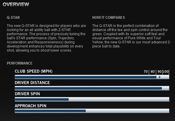 Now, before you get all excited and decide to replace the $45 Z-Star you play with the $25 Q-Star in your arsenal, it’s important to note that the Srixon Q-Star golf ball differs from the premium Z-Star line in several ways. Like I mentioned above, the Q-Star is a 2 piece ball designed for mid to high handicap golfers, where the Z-Star is a 3 piece construction designed as a “tour” ball for better players. The Z-Stars also have thinner covers. The Z-Star XV’s cover is the thinnest in golf at 0.012″ thick. That’s about three tenths of a millimeter! This makes them more responsive for more spin around the greens. The Z-Star and Z-Star XV carry higher compression, because they are designed for golfers who’s swing speeds are over 90 mph.